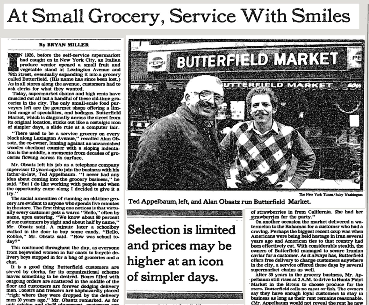 In 1926, before the self-service supermarket had caught on in New York City, an Italian produce vendor opened a small fruit and vegetable stand at Lexington Avenue and 78th Street, eventually expanding it into a grocery called Butterfield.